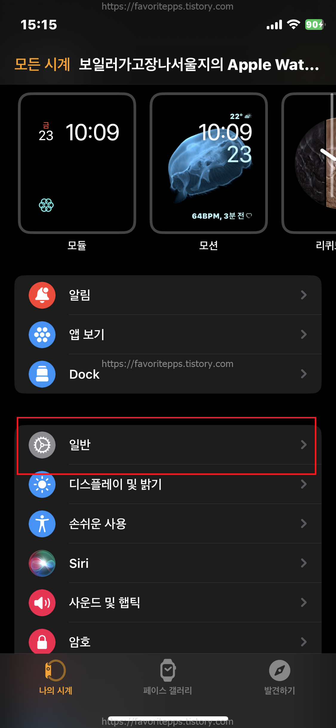 1. 우선 애플워치 받아쓰기 기능을 활성화 하려면 아이폰 워치 앱에서 일반 항목으로 들어간다.