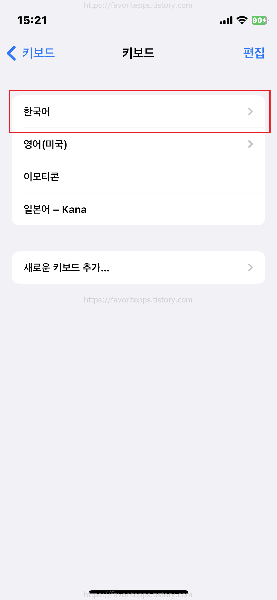 7. 한국어 언어가 없다면 새로운 키보드 추가를 눌러 언어를 추가한다.