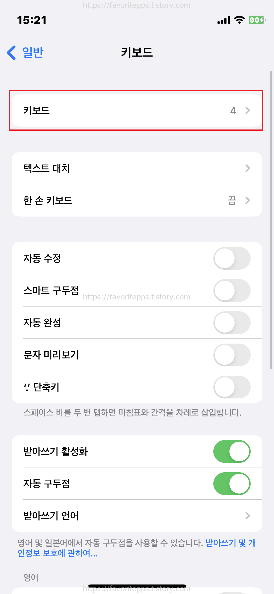 5. 애플워치 받아쓰기에서 한국어, 한글 입력이 안되는 경우 아이폰 설정 > 키보드 > 키보드로 들어가 준다.