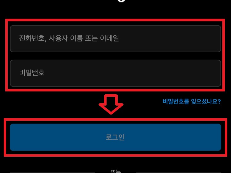 그럼 이제 인스타그램 다른 아이디 로그인 접속창이 조회됩니다. 여기에서 아이디와 비밀번호 입력후 아래 로그인 버튼을 눌러주기만 하면 됩니다.