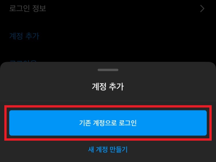 아래에서 목록 팝업창이 뜨게되면 파란색 버튼 기존 계정으로 로그인 부분을 선택하여 줍니다.