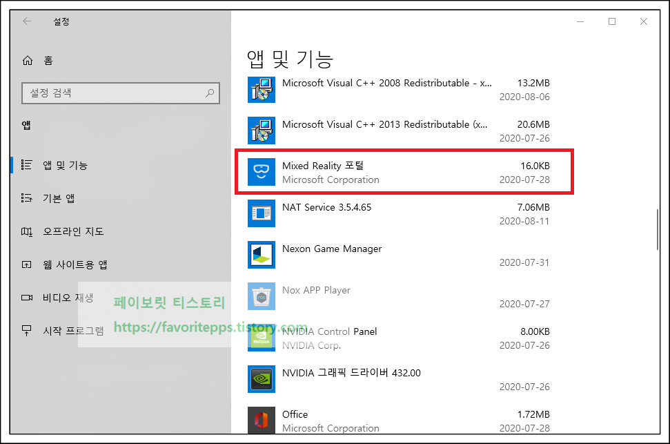 앱으로 들어가면 앱 및 기능 페이지가 뜨게되며 마우스를 이용하여 천천히 목을 아래로 내라다 보면 mixed reality 포털 항목을 발견할 수 있습니다.