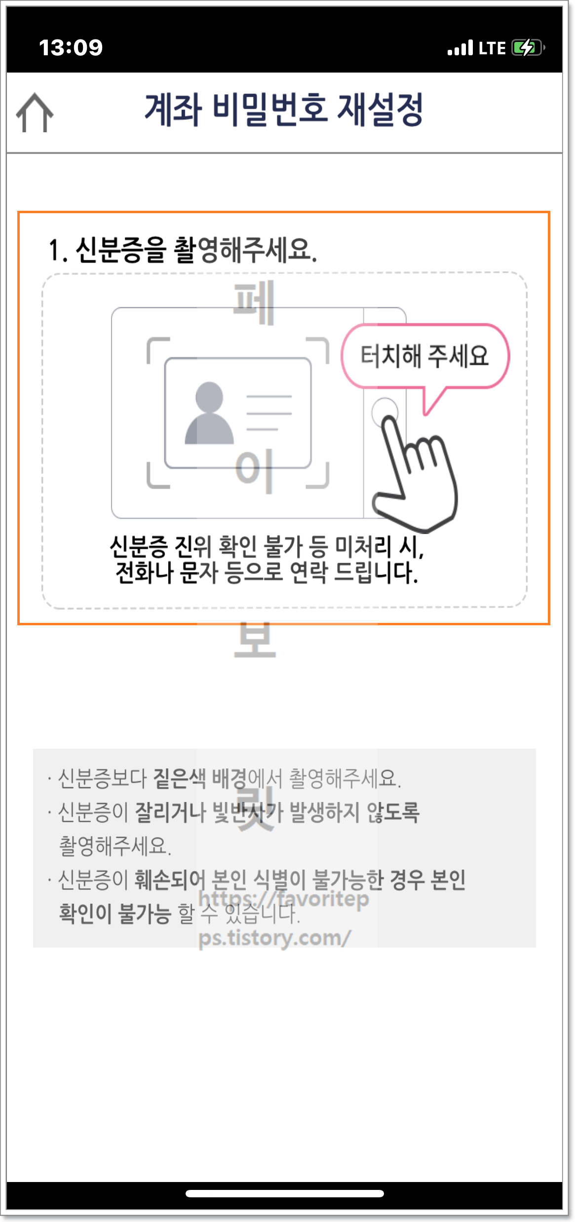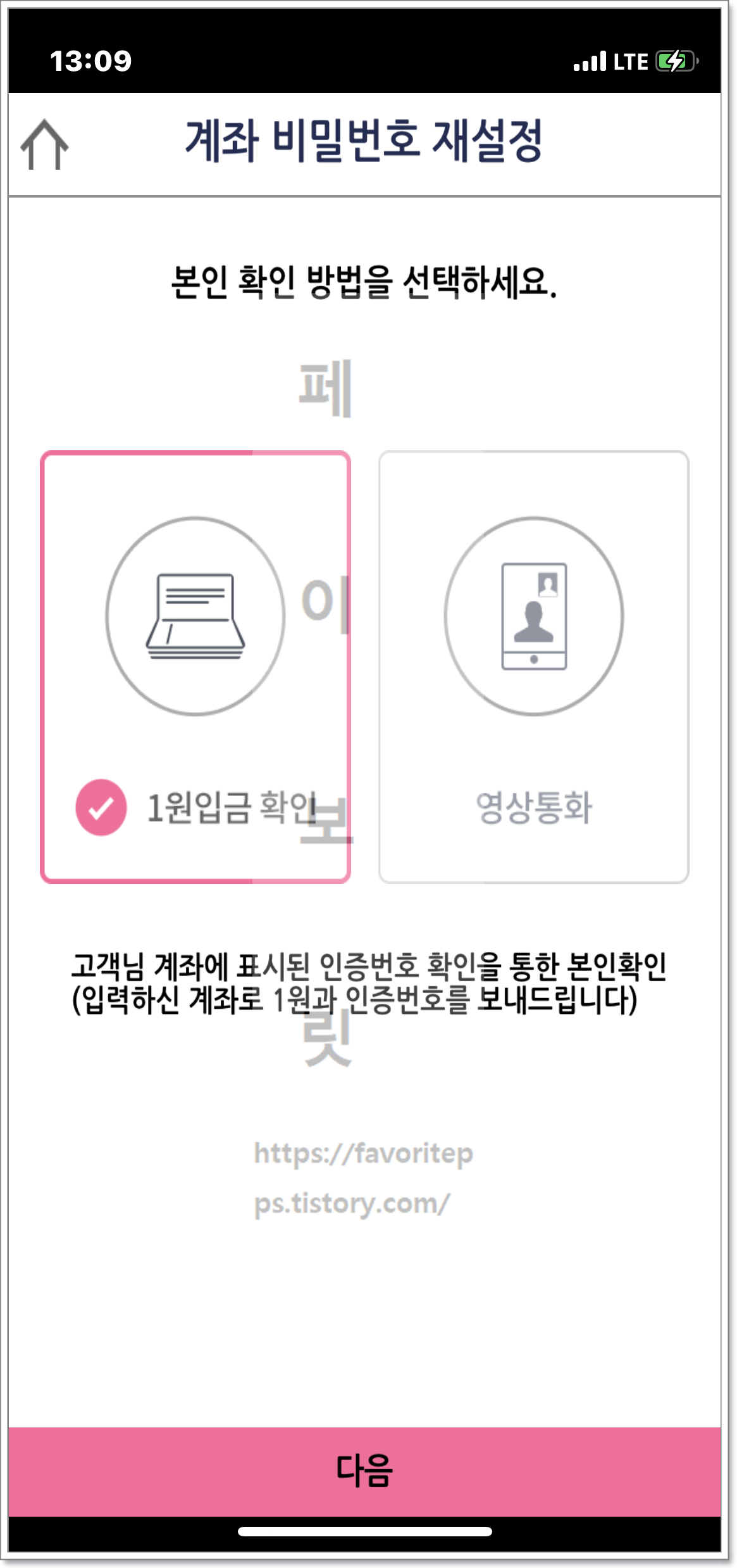 휴대전화 인증이 되면 신분증 촬영이 시작됩니다. 신분증은 짙은색 배경에서 촬영하고 잘리거나 빛반사가 발생하지 않도록 촬영하면 됩니다. 또한 훼손이 되거나 본인 식별이 불가능한 경우 본인 확인이 불가능할 수 있습니다. 신분증 촬영후 우측 화면이 뜨면 1원입금 확인 또는 영상통화 선택후 다음 버튼을 눌러줍니다. 저 같은 경우 1원입금 확인을 선택하였습니다.