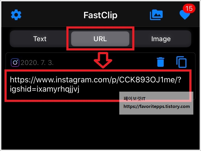 확인이 되었다면 설치 했었던 FastClip 어플로 이동합니다. 그리고 상단에 있는 URL 터치후 아래 게시물 목록이 확인되면 터치하여 주세요.