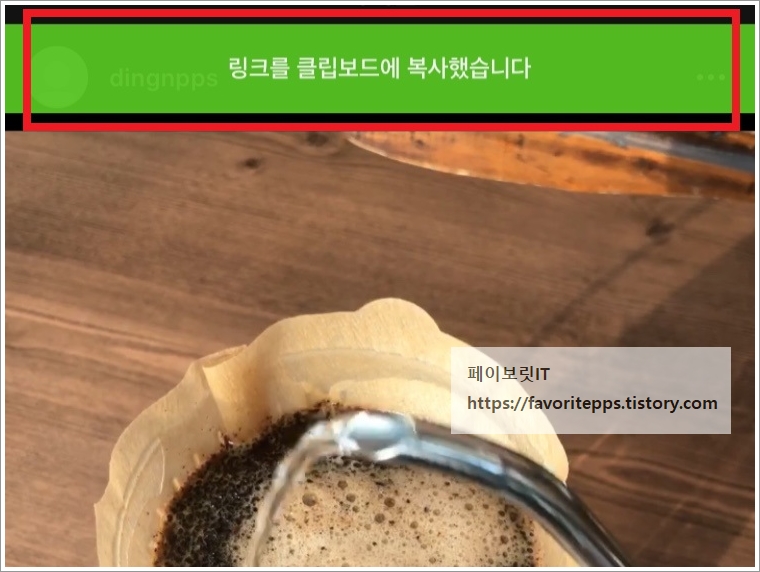 정상적으로 링크 복사가 진행 되었다면 상단에 초록색 바가 생기면서 링크를 클립보드에 복사했습니다. 표시가 나타나게 됩니다. 페이보릿 불펌금지