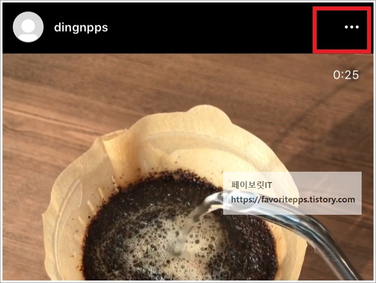 앱 설치가 완료 되었다면 곧바로 인스타그램으로 접속하여 저장하고자 하는 게시물로 들어갑니다. 그리고 우측 상단 점 세개 아이콘을 터치하여 주세요.