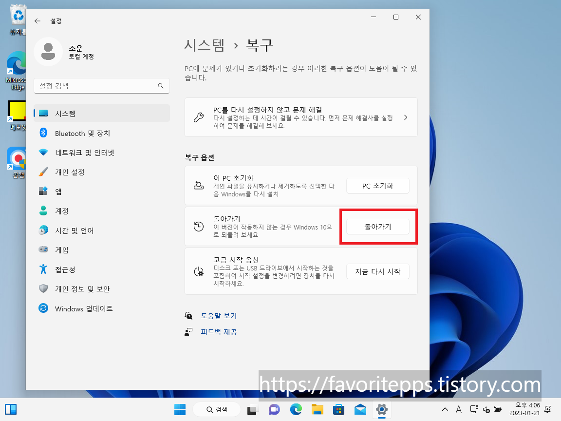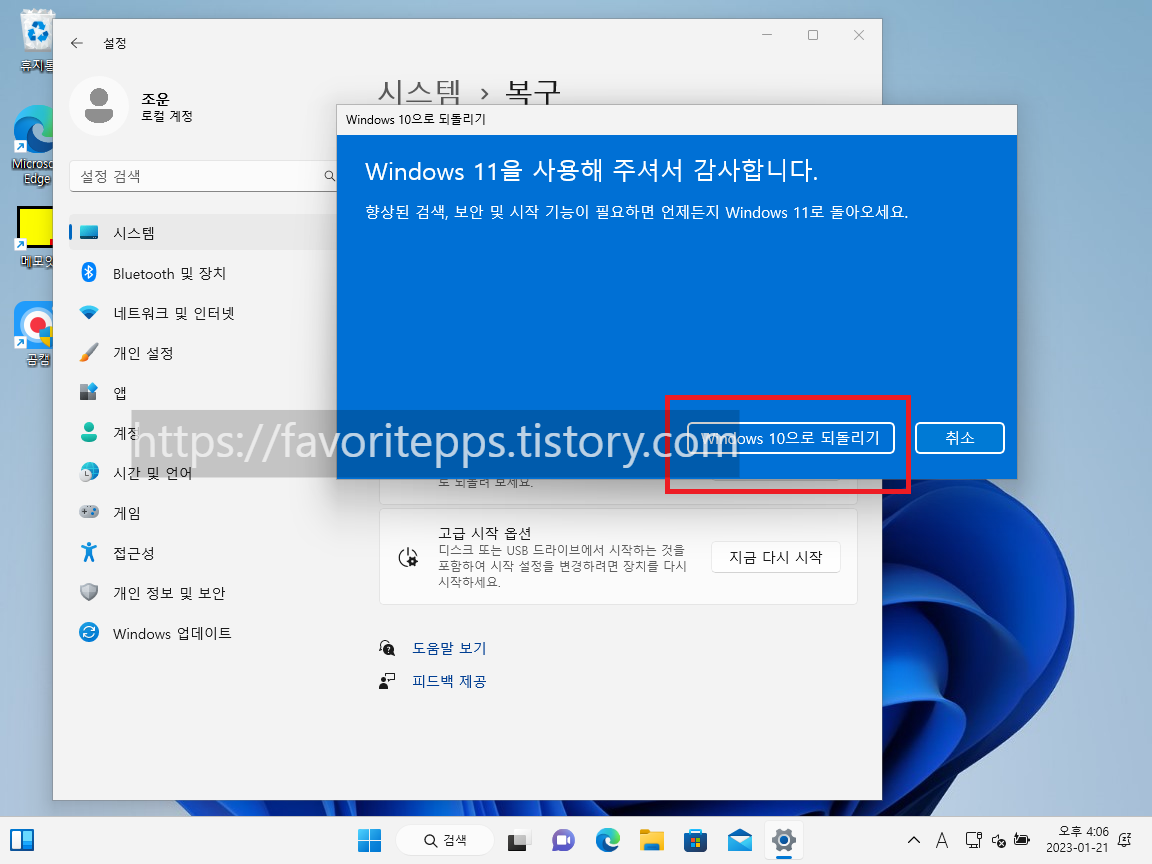 윈도우11을 사용해 주셔서 감사합니다. 페이지로 넘어오면 윈도우 10으로 되돌리기 버튼을 눌러준다.